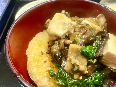 木の子いっぱ~いあんかけ焼きおにぎり・おにくたっぷり♪菱の実も入っているよ☺️。あんかけ焼きおにぎり、おいし~♪あんかけ好き良人も喜んだ。肉好き夫···