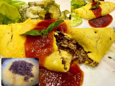 赤米でオムライス~。ケチャップを使ったバターライスの代わりに、レンチン赤米ツナ焼きご飯を使いました。これは日本人にも、イケるご飯になったので···